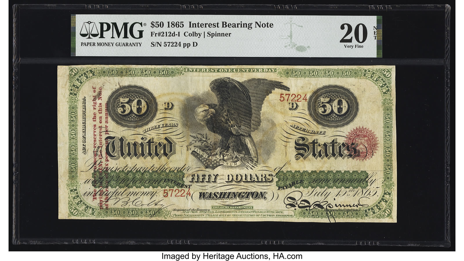 A Fr. 212d-I $50 1865 Interest Bearing Note PMG Very Fine 20 Net (estimate: $80,000)