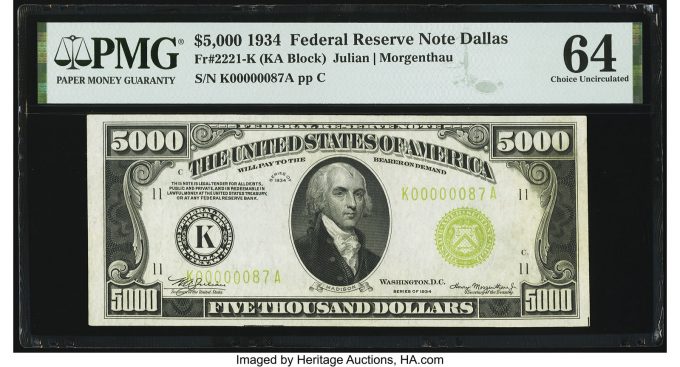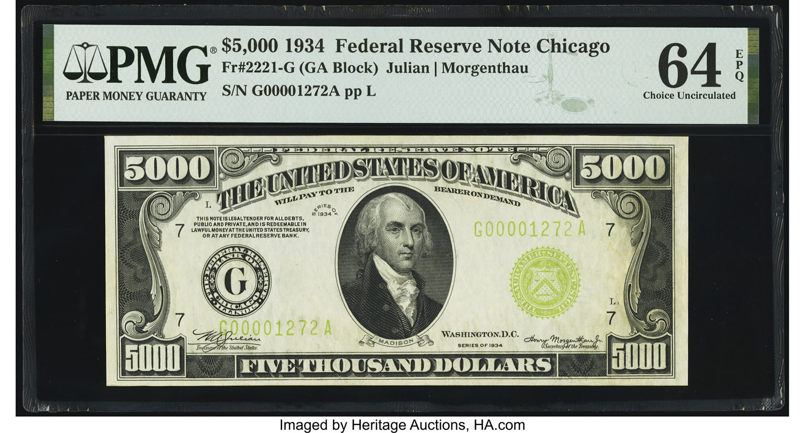 Only 12 other examples from 1928-34 graded by PMG have earned grades equal to or higher than the Fr. 2221-G $5,000 1934 Federal Reserve Note. PMG Choice Uncirculated 64 EPQ (estimate: $200,000+) offered in this auction. This example bears serial number G00001272A, the high serial number listed in the 10th and final edition of the Schwartz-Lindquist reference. Heritage Auctions sold another Series 1934 $5,000 graded PMG 64 EPQ in January for $312,000.