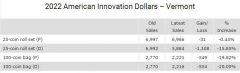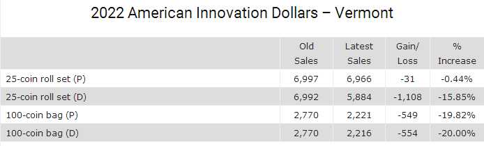 In addition, 19 products registered lower sales compared to 18 in the previous sales report. The reductions ranged from 1 to 1,108, with the latter tagged to the recently released 2022-D Vermont American Innovation 25-Coin Rolls.
