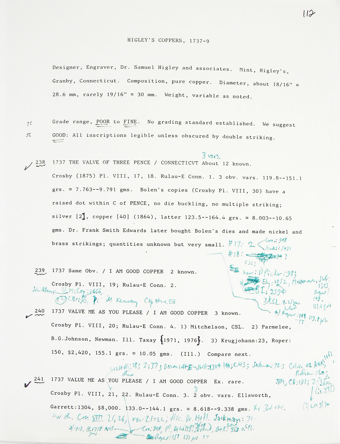 Among the highlights of the donation are two annotated drafts of Breen’s massive 1987 masterpiece, Walter Breen’s Complete Encyclopedia of U.S. and Colonial Coins, with thousands of handwritten notes made as he typically did in different color inks. The combined drafts total over 3,000 pages and were described by auction house Kolbe & Fanning Numismatic Booksellers as "an exceptionally important part of the Breen archives."
