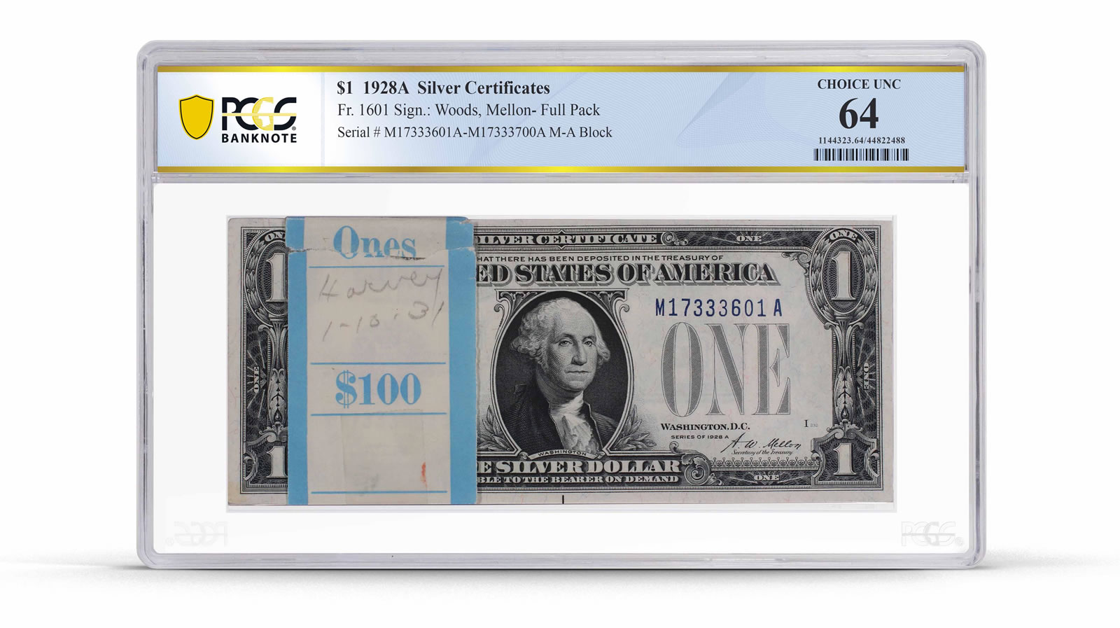 Currently, pack grading is available for U.S. small-size notes in the quantities of a complete full pack of 100 notes or half packs of 50. All notes in the pack are examined by graders, and a single grade is granted as a composite for the entire pack. However, the stated grade does not guarantee that any single given note within will grade at that level if it were submitted individually. Each pack is a single grading fee based on the declared value of the pack with an additional $60 fee for the unique new pack holder. More information and guidelines for submitting packs is available at www.PCGS.com/banknote.