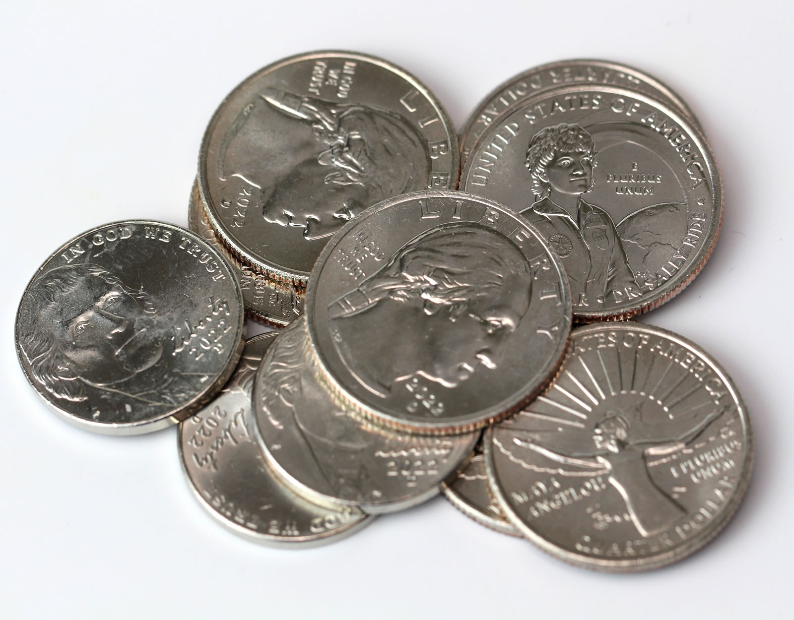 - the 2022 Dr. Sally Ride quarter which began circulating toward the end of March. (The Mint started selling collectible Dr. Ride Sally Angelou quarters in rolls and bags on March 22.)