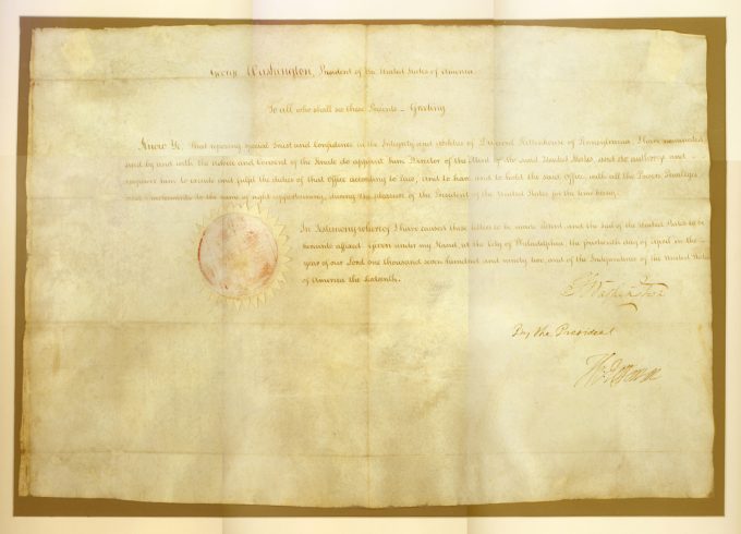 - President George Washington’s 1792 appointment of David Rittenhouse as first Mint Director. The document also is signed by Jefferson who was Secretary of State at the time;