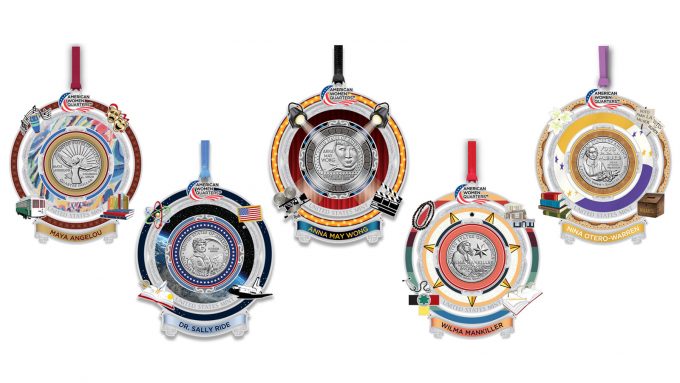 The products are the newest issues from the U.S. Mint’s American Women Quarters™ Program and feature each of the 2022 released quarters in their own ornament. Pricing will be $30.95 per piece with a product limit of 5,000 each.