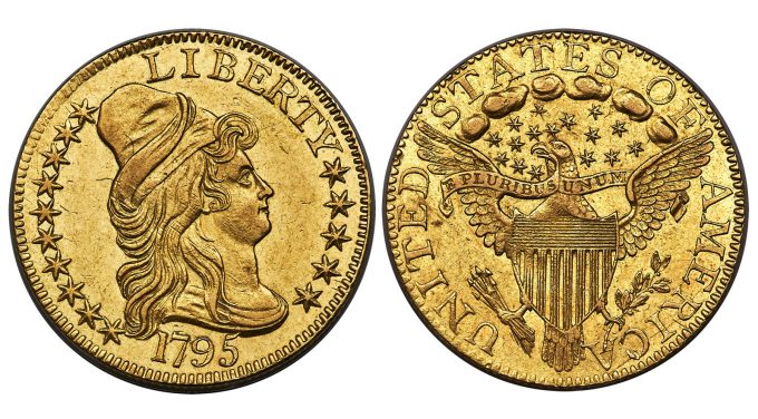 - A 1795 Large Eagle five dollar gold, AU58 PCGS. CAC. Rare BD-14 variety, High R.6 Vibrant surfaces – one of between 14 and 18 examples of which are believed to exist, making BD-14 the second-rarest die pair, with auction appearances often separated by multiple years.