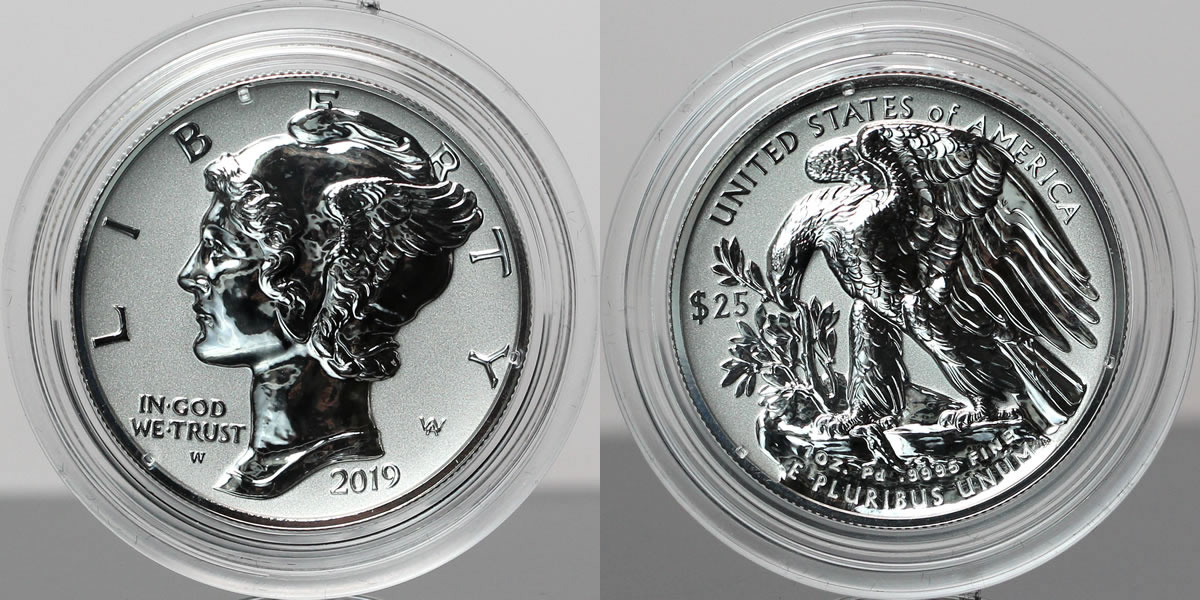 The work of Adolph Weinman is depicted on both sides of the coin as dictated by Public Law 111-303. This law states that the obverse (heads side) must carry a high-relief likeness of ‘Winged Liberty’ from the ‘Mercury dime’ obverse and a reverse (tails side) showing a high-relief version of the 1907 American Institute of Architects Gold Medal reverse.