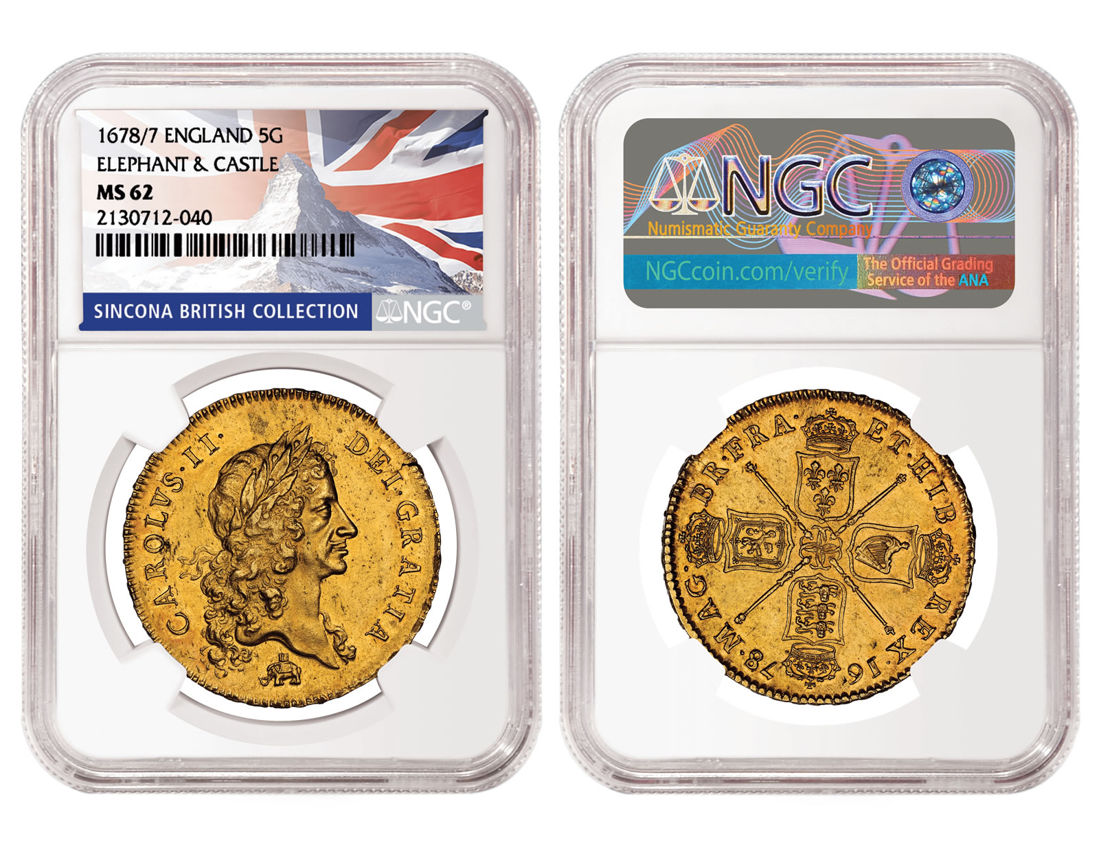 After an interregnum, the monarchy was restored with Charles II (the son of Charles I) on the throne. From late in his reign is a rare England 1678/7 Elephant and Castle 5 Guineas graded NGC MS 62 (lot 1161), which stands alone with the highest grade of four examples in the NGC Census. It has a starting price of CHF 50,000 (about $50,000).