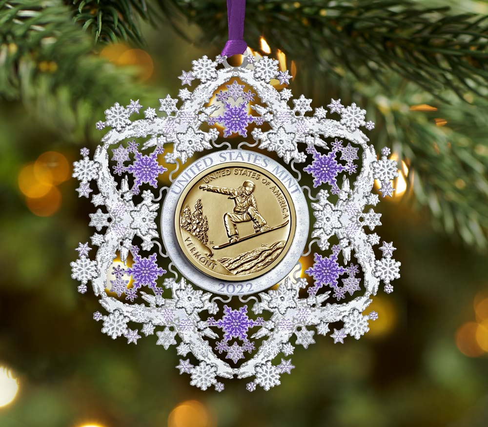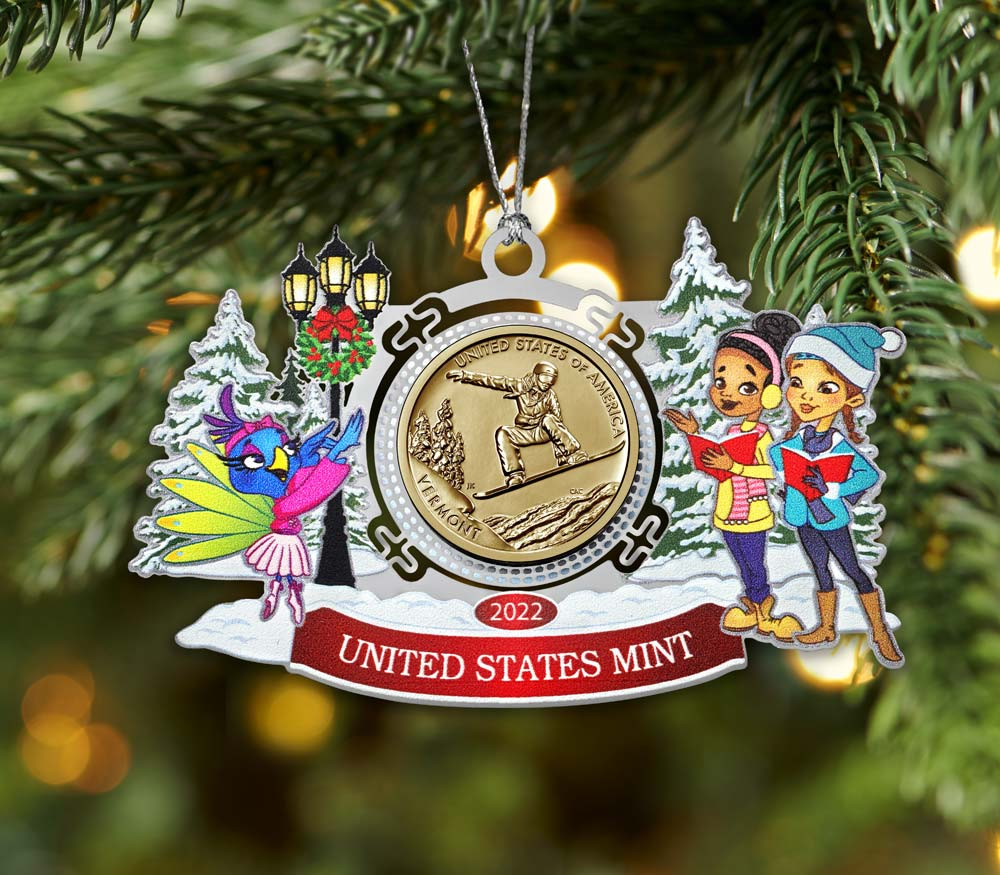 The ornament’s Vermont Innovation dollar is centered with "UNITED STATES MINT" and "2022" printed below. Each is produced from solid brass and finished with the silvery sheen of imitation rhodium.