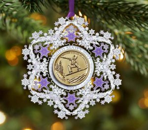 The latest U.S. Mint ornament is shaped like a large snowflake from solid brass with an imitation rhodium finish, resulting in some elements displaying a silver sheen. Colorizations of white, blue, and purple add to the detail of the snowflake.