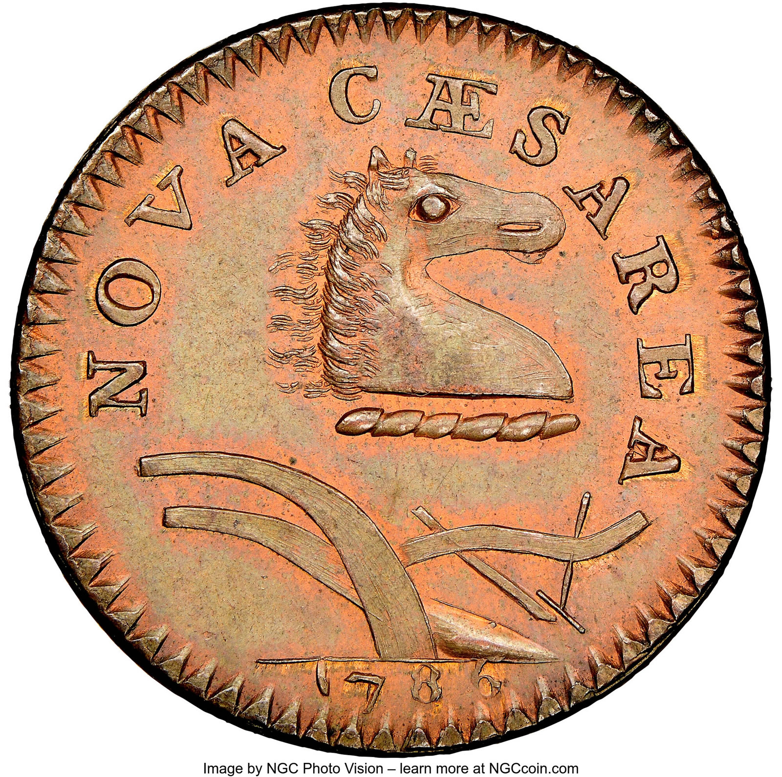 A 1786 Maris 18-M New Jersey Copper is being offered publicly for just the third time in the last century. Featuring the famous "Bridle" crack connecting the tips of the horse’s nose and trunk is only slightly visible on this early die state, it is the single finest New Jersey copper, this piece is the only MS66 NGC coin with none finer (8/22).