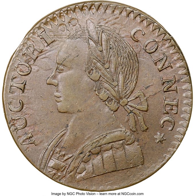 The 1788 Miller 9-E Connecticut Copper, MS63 Brown offered in this auction is likely the finest known of this die pairing. The only piece that comes close is the heavily flawed Ford coin that appeared as part of the Robert Martin Collection, and is graded MS61 Brown NGC. Like most examples, the offered coin is imperfectly centered.