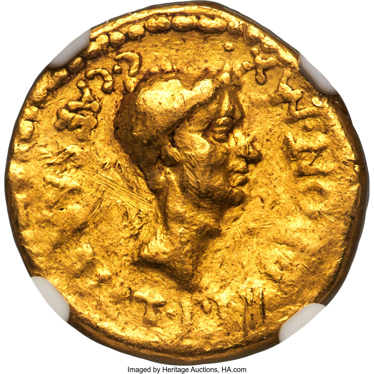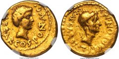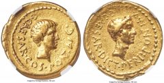 An exceptionally rare Octavian, as Consul (ca. 43 BC), with Julius Caesar, as Dictator Perpetuo and Pontifex Maximus. AV aureus (18mm, 7.89 gm, 3h). NGC Choice Fine 4/5 – 2/5, scratches, edge marks (estimate: $50,000-75,000) offers one of the very few near-contemporary portraits of Julius Caesar in gold. The elusiveness of gold Caesar portraits often is the last hurdle to those collectors of the Roman series who seek a portrait set of the first 12 Caesars in gold aurei.