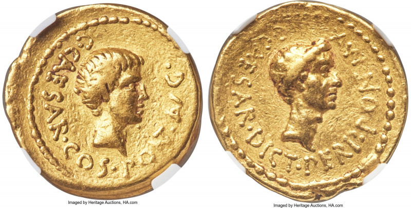 Silver and bronze examples are more plentiful, but it is believed fewer than 50 of all types remain in gold. The offered example is from the type struck closest to Caesar’s lifetime, issued by his grand-nephew and adoptive heir, Octavian. This coin likely was struck at a military mint in southern Gaul upon his assumption of the Consulship in July 43 BC.