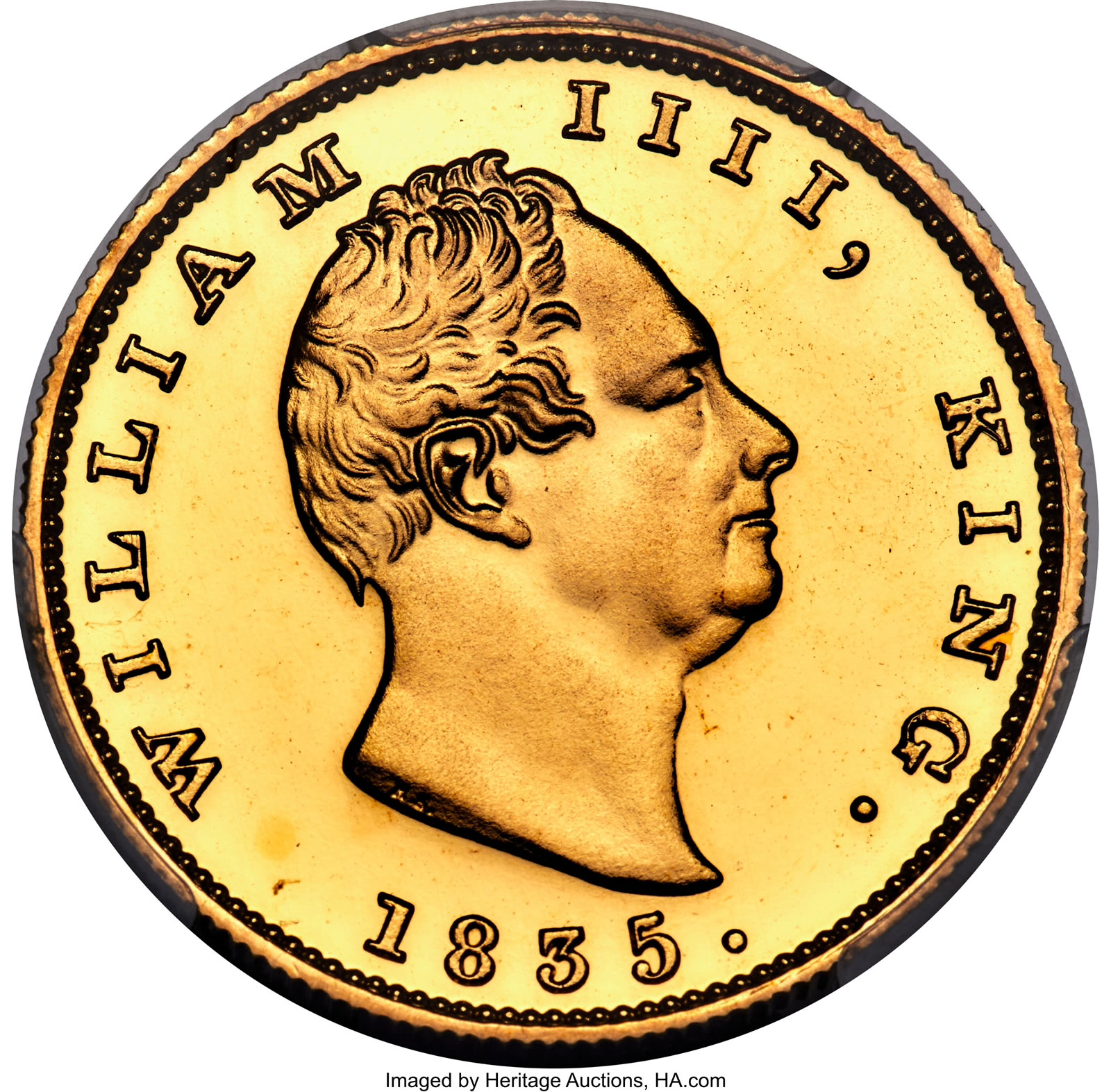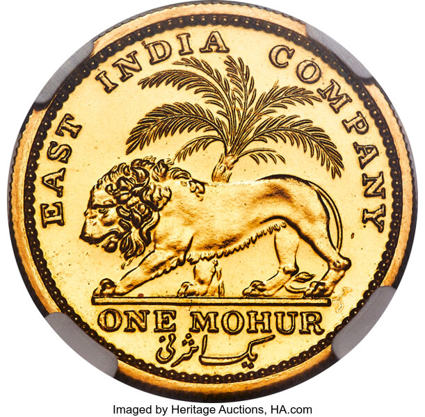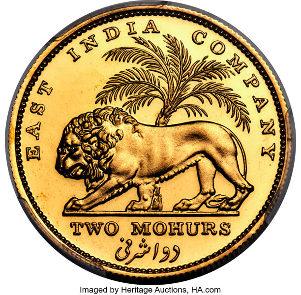 Also offered is the finest certified example of a British India William IV gold Proof Restrike 2 Mohurs 1835.-(c) PR67 Cameo PCGS (estimate: $100,000-120,000). Among all half, single and double Mohur Restrikes currently submitted to NGC and PCGS, only two others grace the lofty PR67 designation, including a single other 1835 2 Mohurs notably lacking the "Cameo" designation bestowed upon this offering, making this an absolute prize among British India collectors.