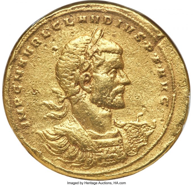 An impressive Claudius II (AD 268-270). AV medallion of 8 aurei (37mm, 39.09 gm, 12h). NGC Choice VF 4/5 – 2/5, Fine Style (estimate: $50,000-75,000) boasts an ornate military bust of this heroic ruler. During the siege of Milan in mid-AD 268, Gallienus was assassinated and Claudius acclaimed emperor in his place by his fellow officers. The Senate approved Claudius’ elevation, but the all-important soldiers proved restive, as Gallienus had treated them well.