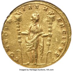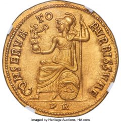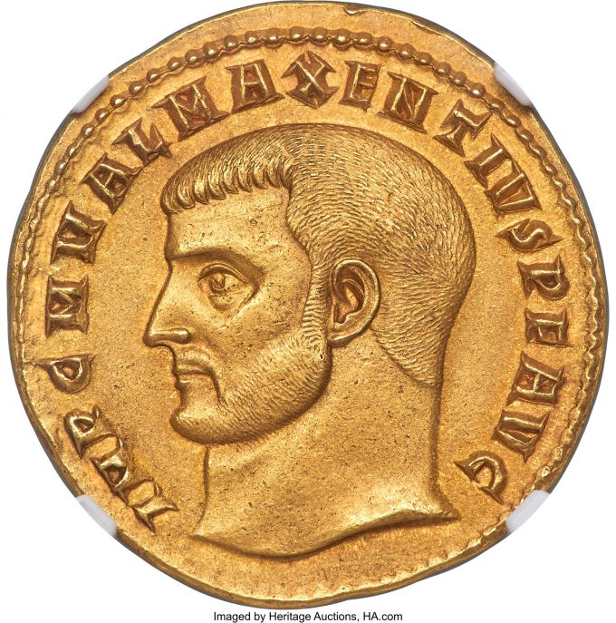 The Maxentius (AD 307-312). AV quaternio or medallion of 4-aurei (33mm, 21.12 gm, 1h). NGC MS 5/5 – 2/5, Fine Style, smoothing is exceptionally rare – the offered example is one of just two known – and comes from the Paramount Collection, one of the top troves ever sold by the world’s leading numismatic auctioneers.