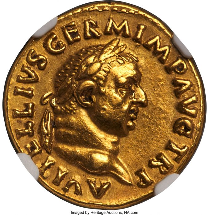 A Vitellius (16 April-22 December AD 69). AV aureus (19mm, 7.41 gm, 7h). NGC Choice XF 5/5 – 3/5, edge marks (estimate: $70,000-100,000) is a popular dynastic issue showing the emperor on the obverse and his father on the reverse.