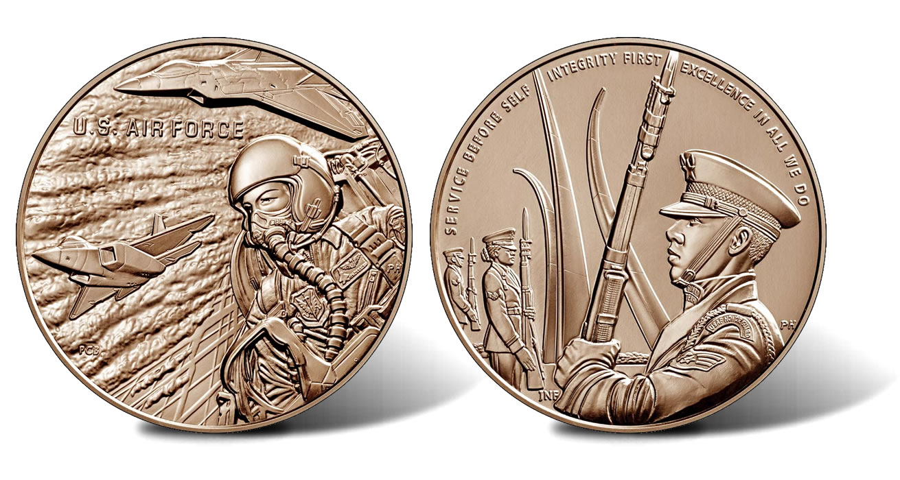 The United States Mint is now selling a bronze version of the two Air Force Silver Medals that were issued as a part of their U.S. Armed Forces Silver Medal Program. The Mint program honors the six branches of the Armed Forces — Air Force, Army, Coast Guard, Marine Corps, Navy, and Space Force.