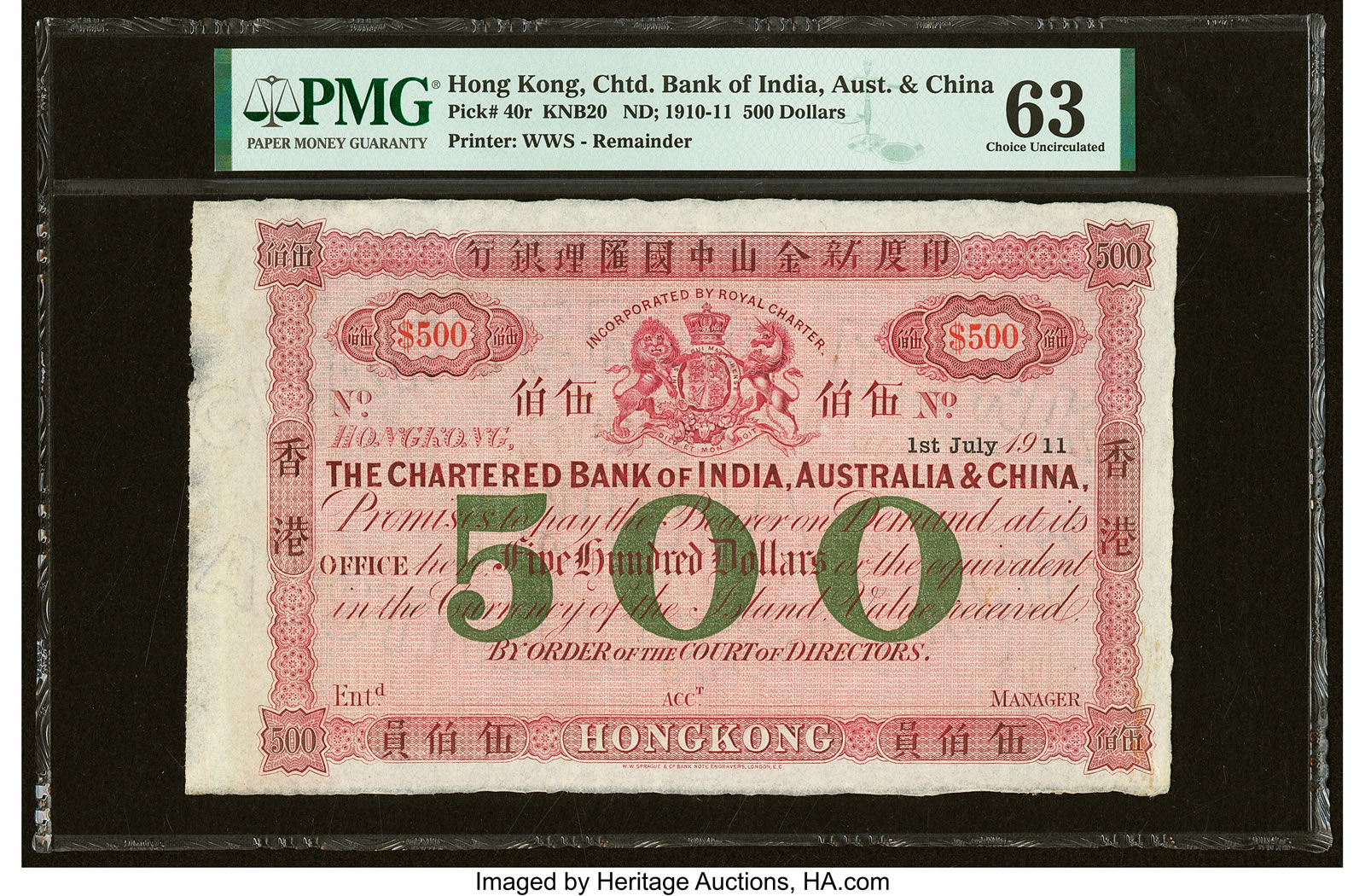 The Hong Kong Chartered Bank of India, Australia & China 500 Dollars 1.7.1911 Pick 40r Remainder PMG Choice Uncirculated 63 (estimate: $150,000+) represents a design and denomination that is missing from nearly all collections. The Chartered Bank of India, Australia & China was founded in the 1850s and opened its first branch in Hong Kong in 1859.