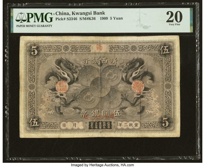 An exceedingly rare China Kwangsi Bank 5 Yuan 1909 Pick S2346 S/M#K36 PMG Very Fine 20 (estimate: $50,000+) is one of two denominations featuring this design theme: dragons flanking silver crown-sized coins, and the higher-graded of just two examples of this note graded in the PMG Population Report. After the Kwangsi Imperial Bank went bankrupt, the Kwangsi Bank opened and began issuing banknotes in Guilin in 1910. Issuance was small compared to the larger and more prolific banks operating in nearby Kwangtung Province, hence why early issues from Kwangsi are so rare and desirable today.