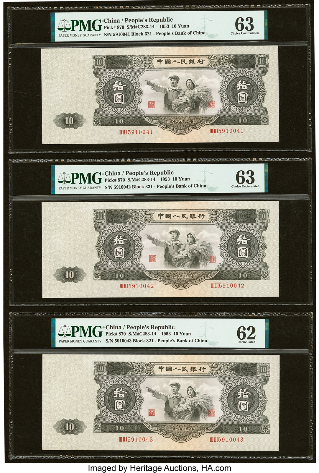 The famed 10 Yuan of 1953 was the highest denomination of this short series, but was not released until 1957 and was withdrawn beginning in 1964, making it a rare type in any grade and making Uncirculated examples coveted prizes for collectors. This China People’s Bank of China 10 Yuan 1953 Pick 870 S/M#C283-14 Three Consecutive Examples PMG Choice Uncirculated 63 (2); Uncirculated 62 (estimate: $200,000+) was created to bring denominations to a manageable level. This 10 Yuan is large and imposing, and it represented a large sum of money at the time. This lot consists of three consecutive serial numbered examples.