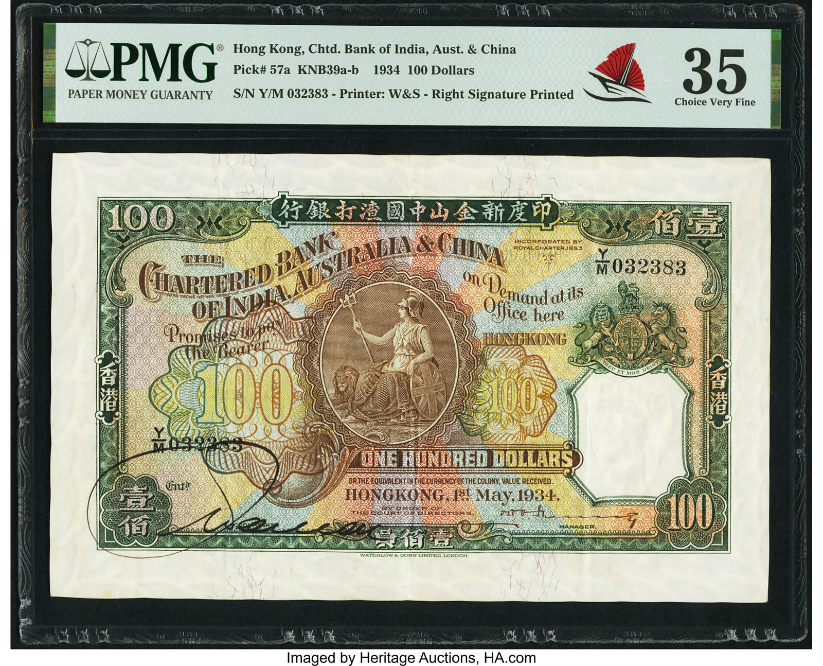 A Hong Kong Chartered Bank of India, Australia & China 100 Dollars 1.5.1934 Pick 57a KNB39 PMG Choice Very Fine 35 (estimate: $30,000+)