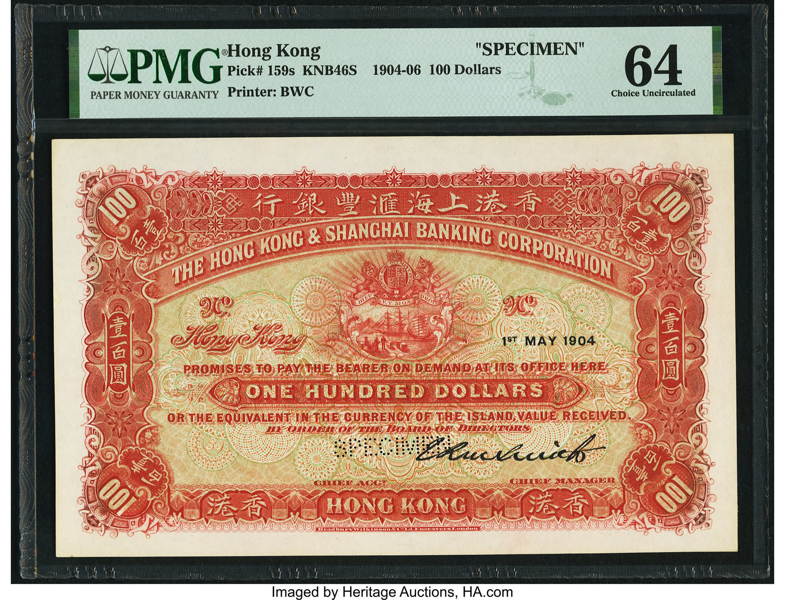A Hong Kong Hongkong & Shanghai Banking Corp. 100 Dollars 1.5.1904 Pick 159s KNB46S Specimen PMG Choice Uncirculated 64 (estimate: $30,000+) — the finest-graded 100 dollars Specimen