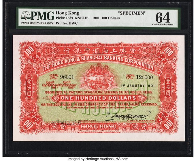 A Hong Kong Hongkong & Shanghai Banking Corp. 100 Dollars 1.1.1901 Pick 153s Specimen PMG Choice Uncirculated 64 (estimate: $40,000+) is tied for the finest grade among the four examples graded by PMG. Heritage Auctions previously has offered this type in Proof format, but never in Specimen or Issued formats.