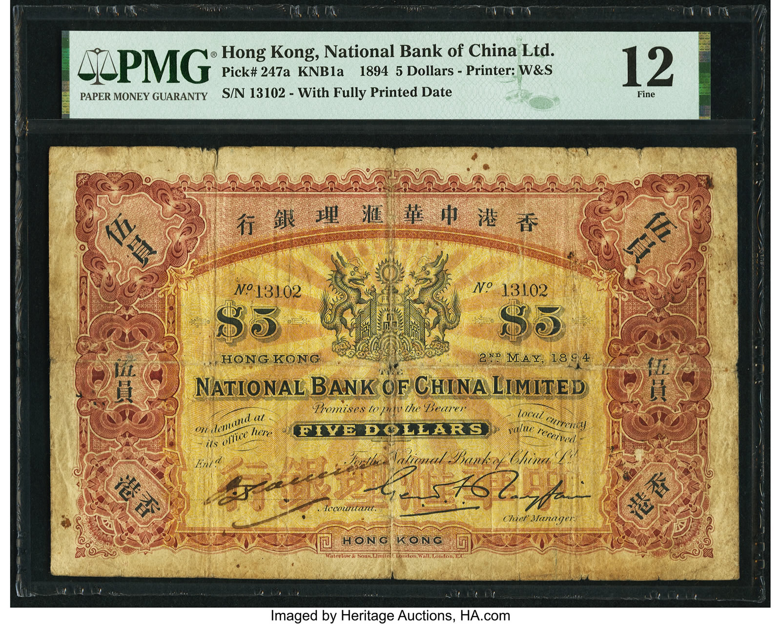 Banknotes from the National Bank of China, Limited are exceedingly rare and incredibly desirable. Prominent, larger banks issued a greater quantity of banknotes than this smaller issuer, which released just $450,000 worth of notes, as banknote operations existed for only two years; in 1895, the Government of Hong Kong cancelled this bank’s currency issuing operation. Waterlow & Sons printed this stunning Hong Kong National Bank of China Limited 5 Dollars 2.5.1894 Pick 247a KNB1a PMG Fine 12 (estimate: $80,000+), which features intricate guilloche work and handsome design elements. Heritage Auctions has offered this famed rarity only once before, and few are known in private hands, making opportunities to acquire this legendary banknote are few and far between.