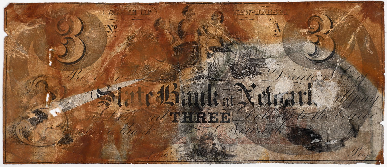 One of the five banknotes in the December auction is a $3 denomination note issued by the State Bank of Newark, New Jersey. It is the only known example to have been in circulation, apparently used to purchase a ticket on the legendary ship at dockside the day the ship left New York on a voyage to Panama.