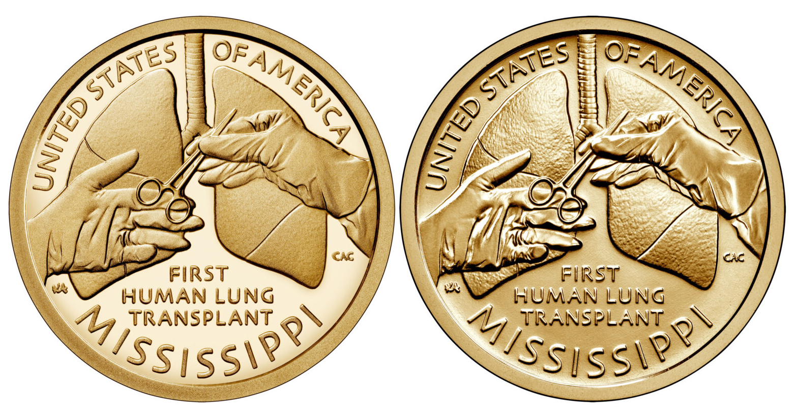 The Mississippi $1 Coin design features a pair of human lungs in the background, while a surgical assistant passes forceps to the surgeon during the first lung transplant surgery. Inscriptions are "UNITED STATES OF AMERICA," "FIRST HUMAN LUNG TRANSPLANT," and "MISSISSIPPI."
