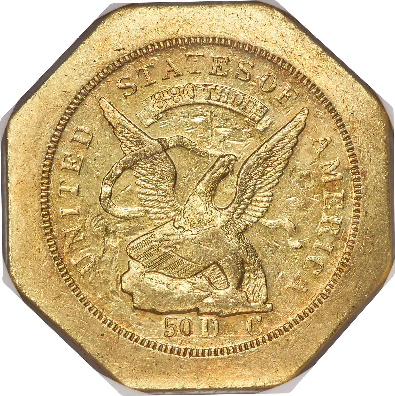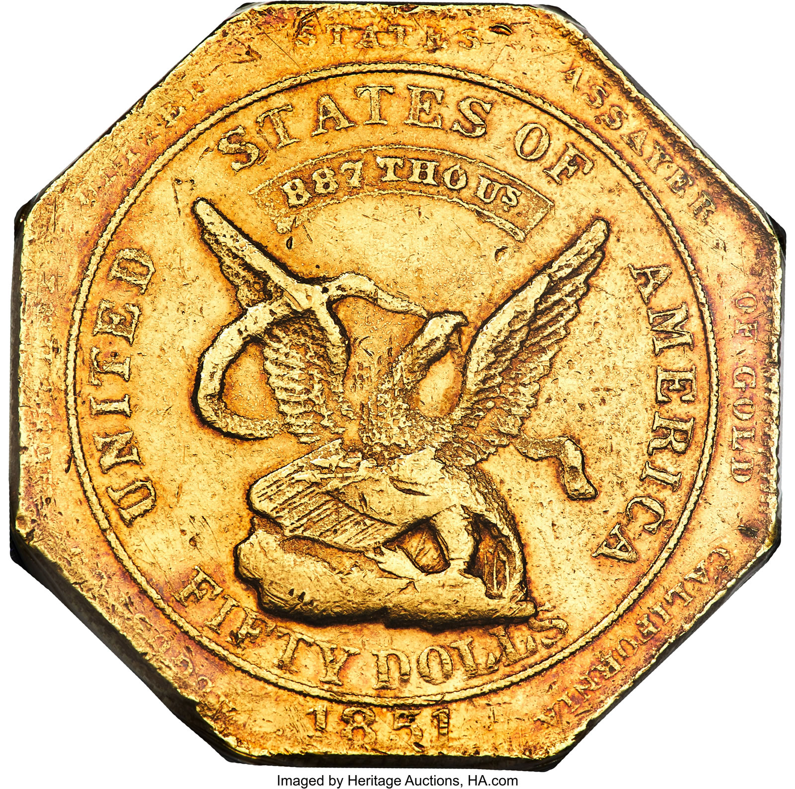 Also reaching six figures was a 1851 Humbert Fifty Dollar, MS61, which prompted 51 bids before ending at $115,200. Colloquially known as "slugs," Humbert fifties had the advantage of having been struck by authority of the federal government and accepted at the Custom House of payment of duties. They were also widely used by banks and merchants in larger transactions. Although the Humbert slugs were manufactured in large quantities, most eventually were melted. Those that survive are either heavily worn or impaired, and often are both.