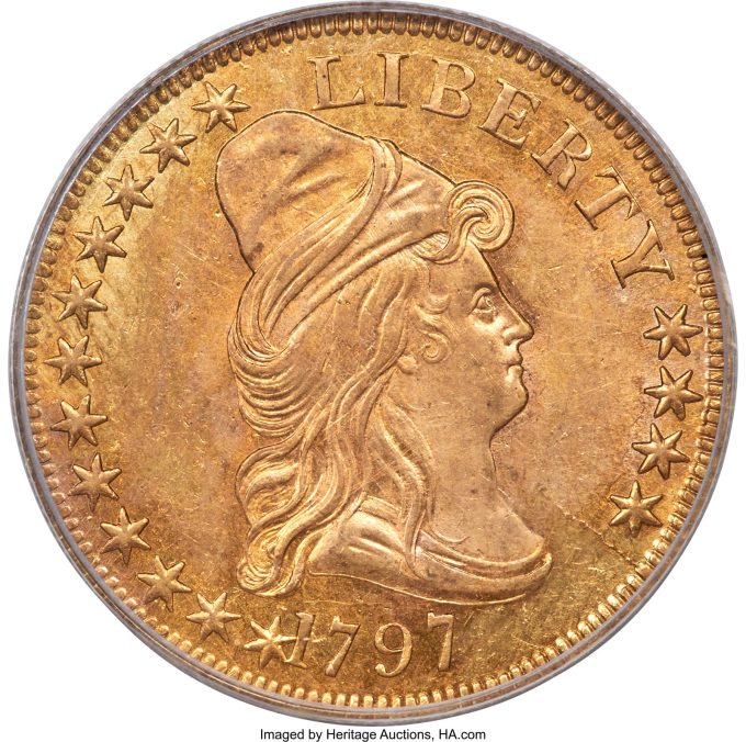 A 1797 Capped Bust Right Eagle, MS60, rarely seen in Mint State, is the only Small Eagle 1797 ten dollar variety, classified as BD-1 in the standard series reference. Die state evidence reveals that some of the 1796-dated pieces were actually struck after the 1797 coins, leading to the conclusion that there must have been a remarriage of the 1796 dies after the 1797 pieces were struck. This coin is tied with one other example for fifth place in the PCGS CoinFacts Condition Census.