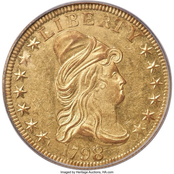 A 1798/7 Eagle, BD-2, AU58 is one of 20-30 known to exist and one of only four examples in AU58 (all PCGS coins) with a combined PCGS and NGC total of five Mint State coins finer (this example is tied with one other example for the No. 5 spot in the PCGS CoinFacts Condition Census). It has been off the market for more than seven years, and it could be another decade or more before another example of comparable quality is available.