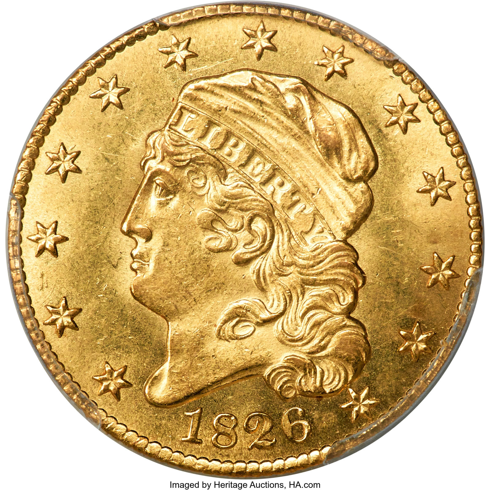 The only gold CAC example of an 1826 Capped Head Half Eagle, MS62 PCGS is another prized offering from the Bender Collection. The 1826 BD-1 half eagle is a rare issue in today’s market, with most survivors in Mint State grades, with a surviving population of just 30-35 examples in all grades, according to PCGS CoinFacts — a figure that agrees with estimates made by earlier researchers and indicates that the population has been stable for some time.