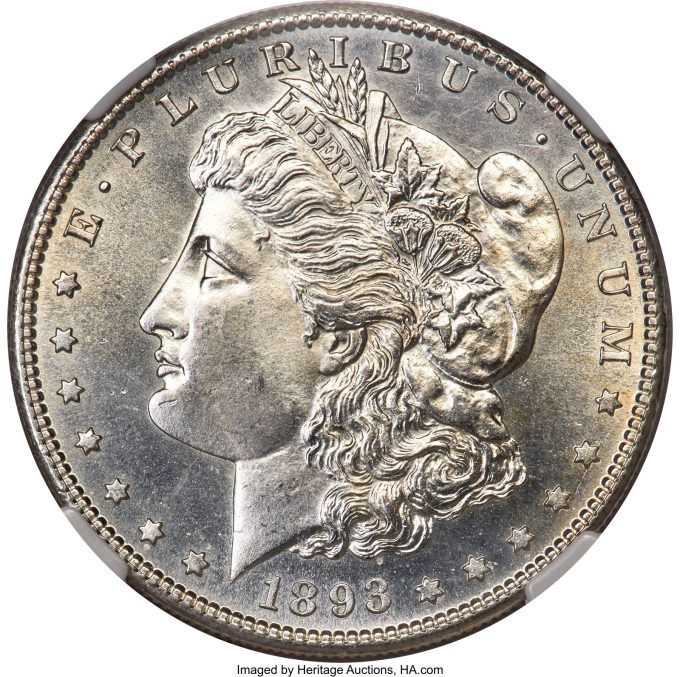 An 1893-O Morgan Dollar, MS63 is a low-mintage branch mint issue is a high-grade example of a prized coin from a mintage of just 300,000. The 1893-O is a better date in this popular series, especially in high grade.