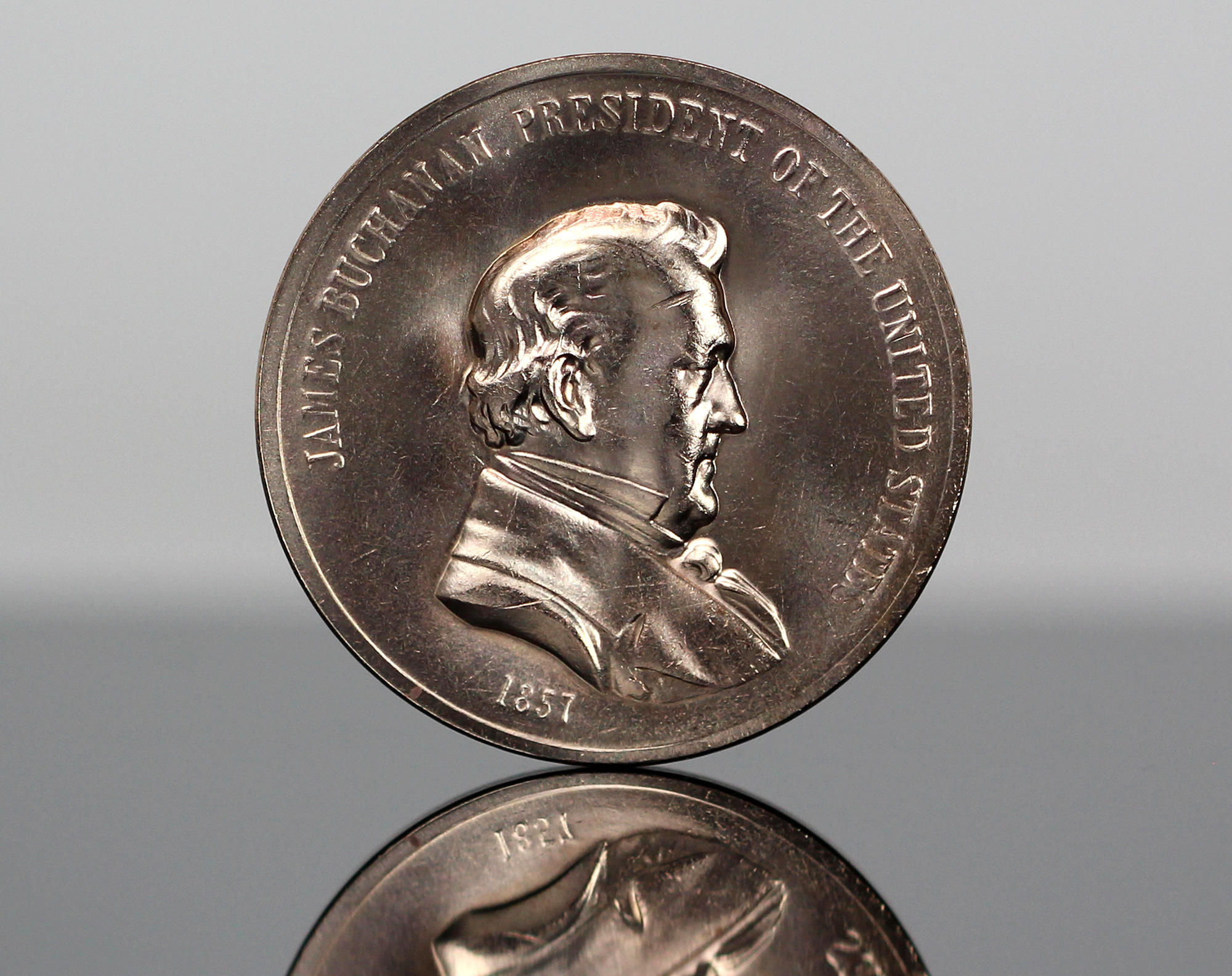 Obverses (heads side) of the new medal show a portrait of the former President as designed by Salathiel Ellis. Inscriptions around the likeness read: "James Buchanan," "PRESIDENT OF THE UNITED STATES," and "1857."