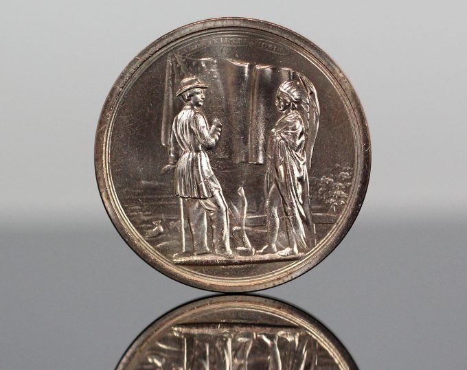 Designed by J. Willson, the medal’s reverse (tails) depicts a farmer, leaning on a plow and conversing with an Indian Chief, with an American flag in the background.