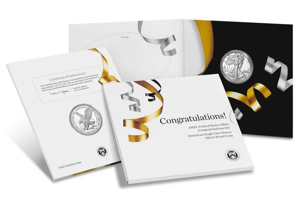 "The 2023 United States Mint Congratulations Set features an American Eagle Silver Proof Coin bearing the ‘W’ mint mark of the West Point Mint," promotes the Mint. "It’s the perfect way to say ‘congratulations’ to special people in your life for milestone achievements and anniversaries — a meaningful and unique gift they will treasure for years to come."
