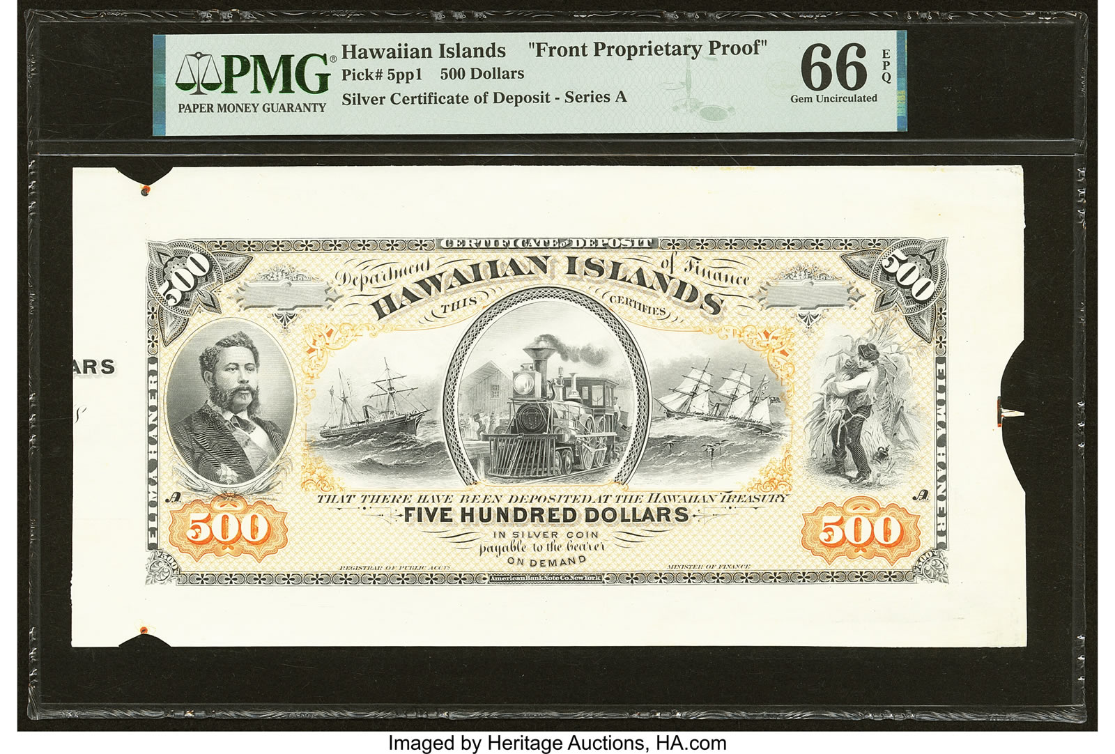 A Kingdom Of Hawaii, Department of Finance 500 Dollars ND (1879) Pick 5pp1 Front Proprietary Proof PMG Gem Uncirculated 66 EPQ (estimate: $15,000+)