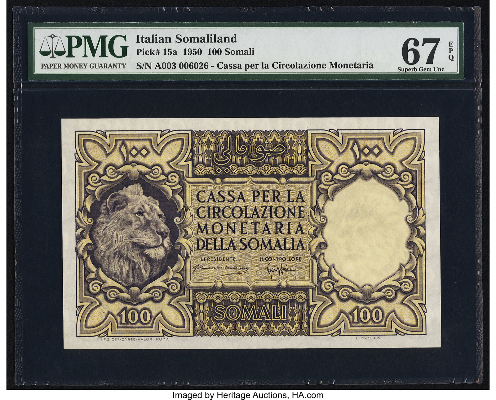 An Italian Somaliland Cassa Per La Circolazione Monetaria Della Somalia 100 Somali 1950 Pick 15a PMG Superb Gem Unc 67 EPQ(estimate: $15,000+)