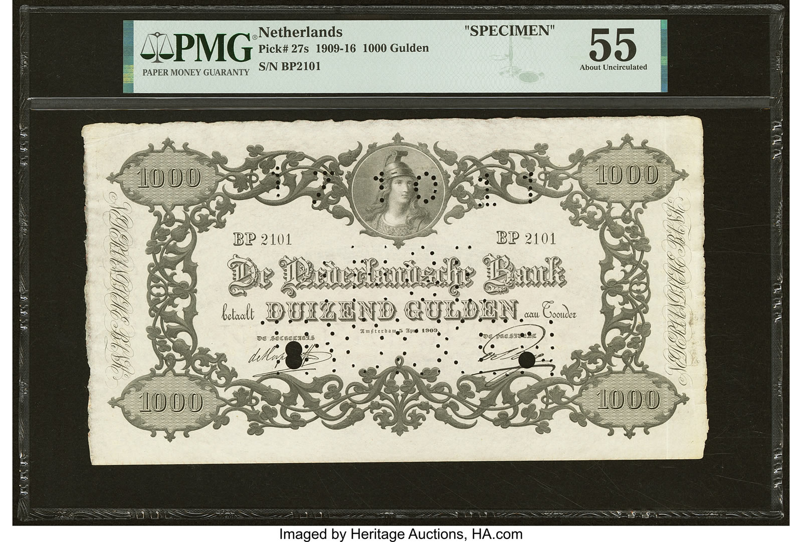 A Netherlands Bank 1000 Gulden 5.4.1909 Pick 27s Specimen PMG About Uncirculated 55 (estimate: $60,000+)
