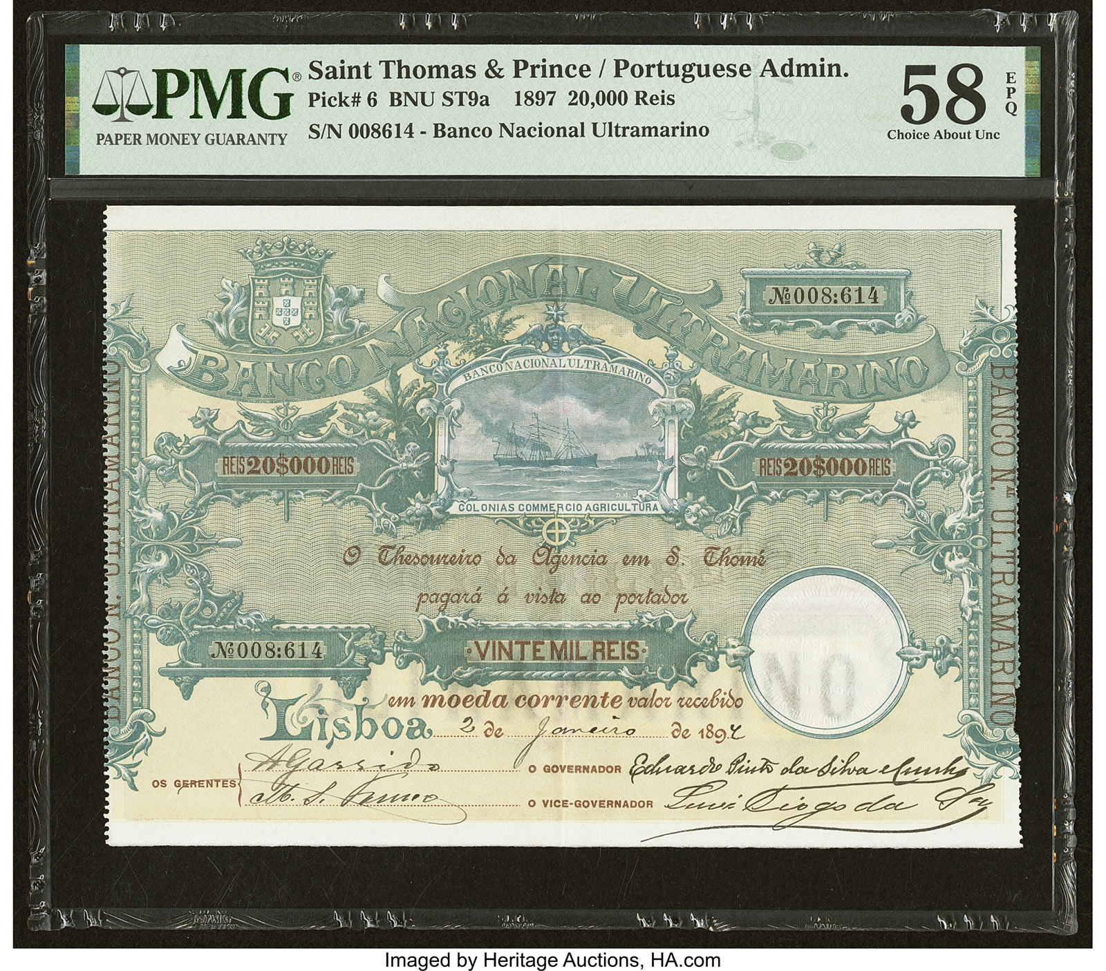 A Saint Thomas and Prince Banco Nacional Ultramarino 20,000 Reis 2.1.1897 Pick 6 PMG Choice About Unc 58 EPQ (estimate: $15,000+)