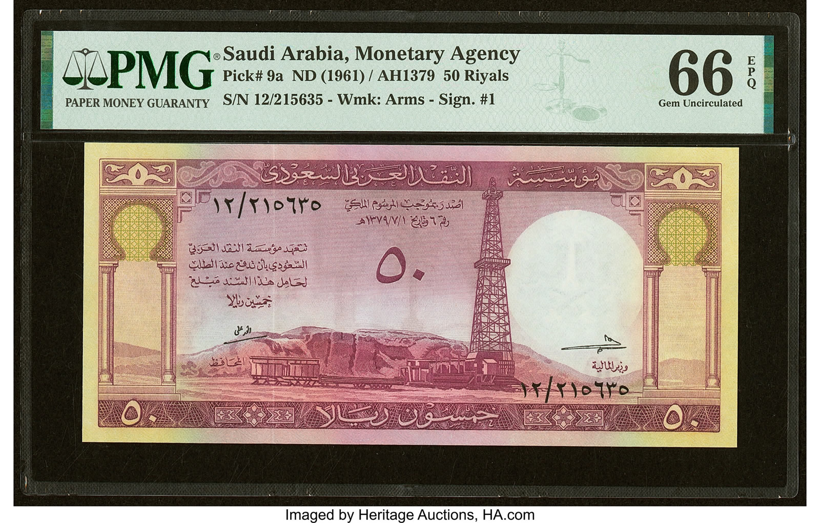 A Saudi Arabian Monetary Agency 50 Riyals 1961 / Ap379 Pick 9a PMG Gem Uncirculated 66 EPQ (estimate: $6,000+) is the finest-graded example in the PNG Population Report of the highly desirable 1961 series of notes issued by the Saudi Arabian Monetary Agency — a series in which this 50 Riyals is a key denomination.