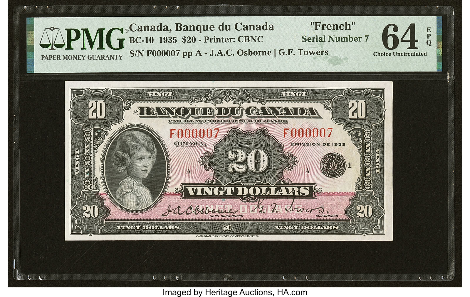A Serial Number 7 Canada Bank of Canada $20 1935 BC-10 French Text PMG Choice Uncirculated 64 EPQ (estimate: $25,000) is among a trove of nearly 60 lots from the Great White North, one of the best selection of Canadian banknotes ever brought to auction. This magnificent note, from the Harry M. Eisenhauer Collection, is an original and Uncirculated example of one of Canada’s most famous banknotes, and the very first to feature a portrait of the eventual Queen, Elizabeth II.