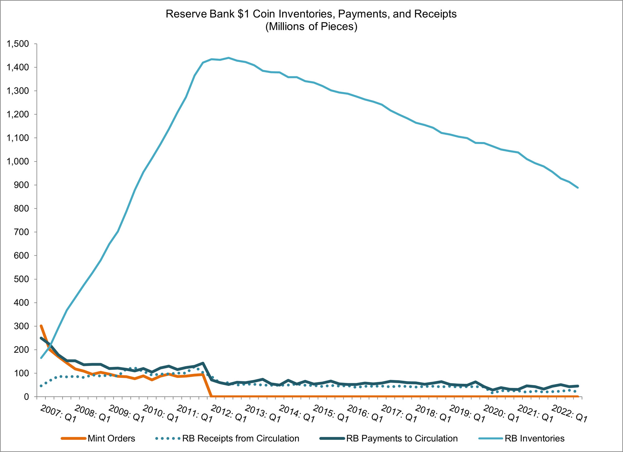 Reserve Bank inventories of $1 coins peaked to 1.44 billion in the third quarter of 2012. They have trended lower since that peak by several million every month.