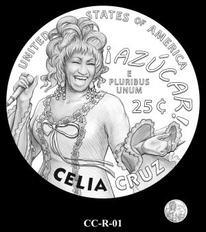 CCAC: Mr. Omer Pardillo, former manager to Ms. Cruz and executor of her estate, joined the CCAC for discussion of the six reverse candidate designs. The CCAC recommended unanimously reverse design CC-R-01, which portrays Ms. Cruz with her dazzling smile while performing in a rumba style dress with her signature catchphrase "AZUCAR!" inscribed on the coin. This design was also favored by Mr. Pardillo and the US Commission on Fine Arts (CFA)