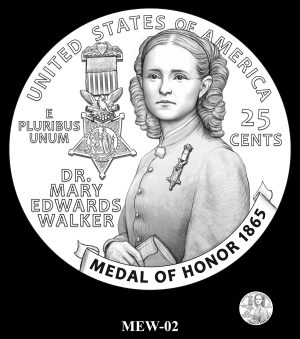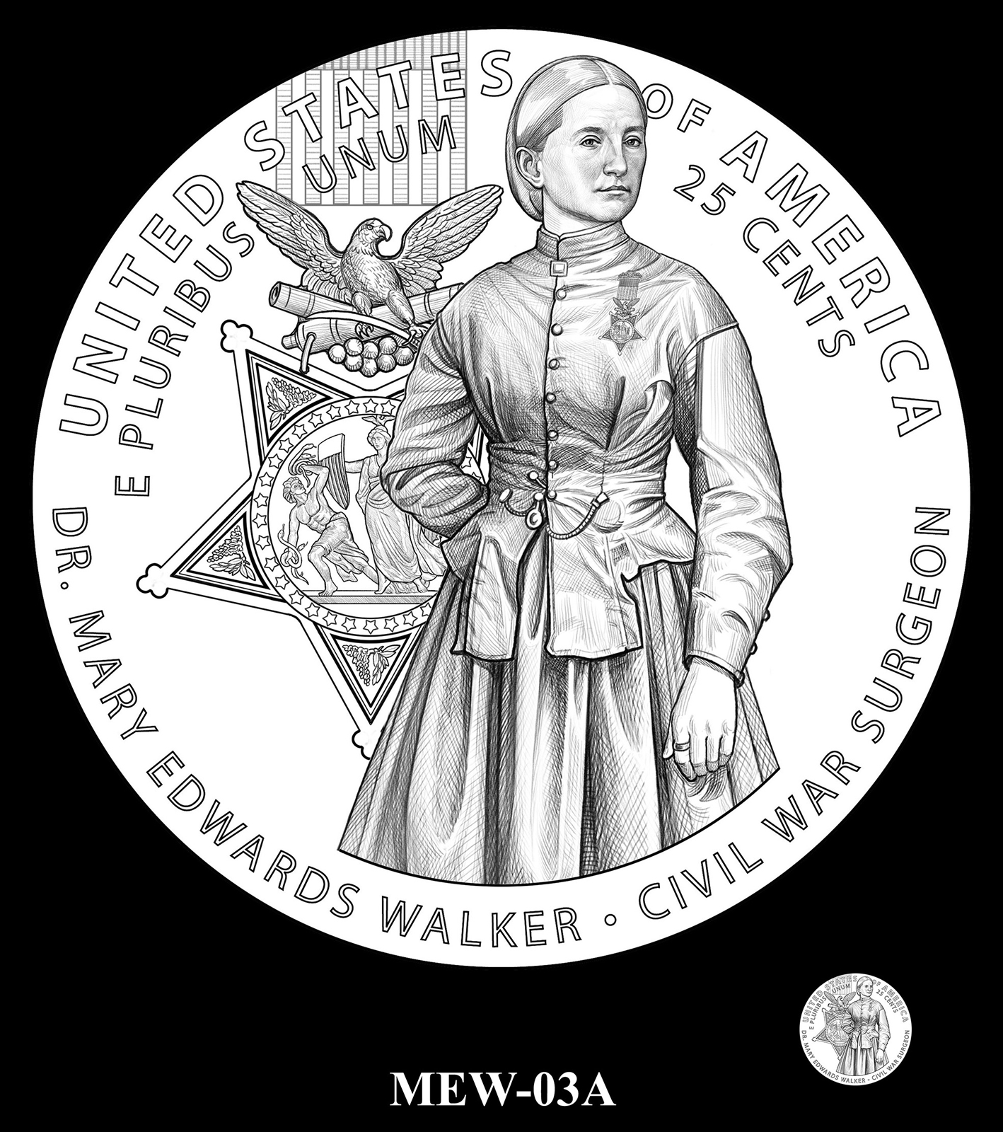 CFA: The Commission members recommended combining the portrait of alternative MEW-02 — the preference of Dr. Walker’s family representative — with the layout of alternative MEW-03A, which they said provides a better composition and a simpler depiction of the Medal of Honor. They commented that the inscription "Civil War Surgeon" and the nearly full-length portrait in MEW-03A better illustrate her profession and era.