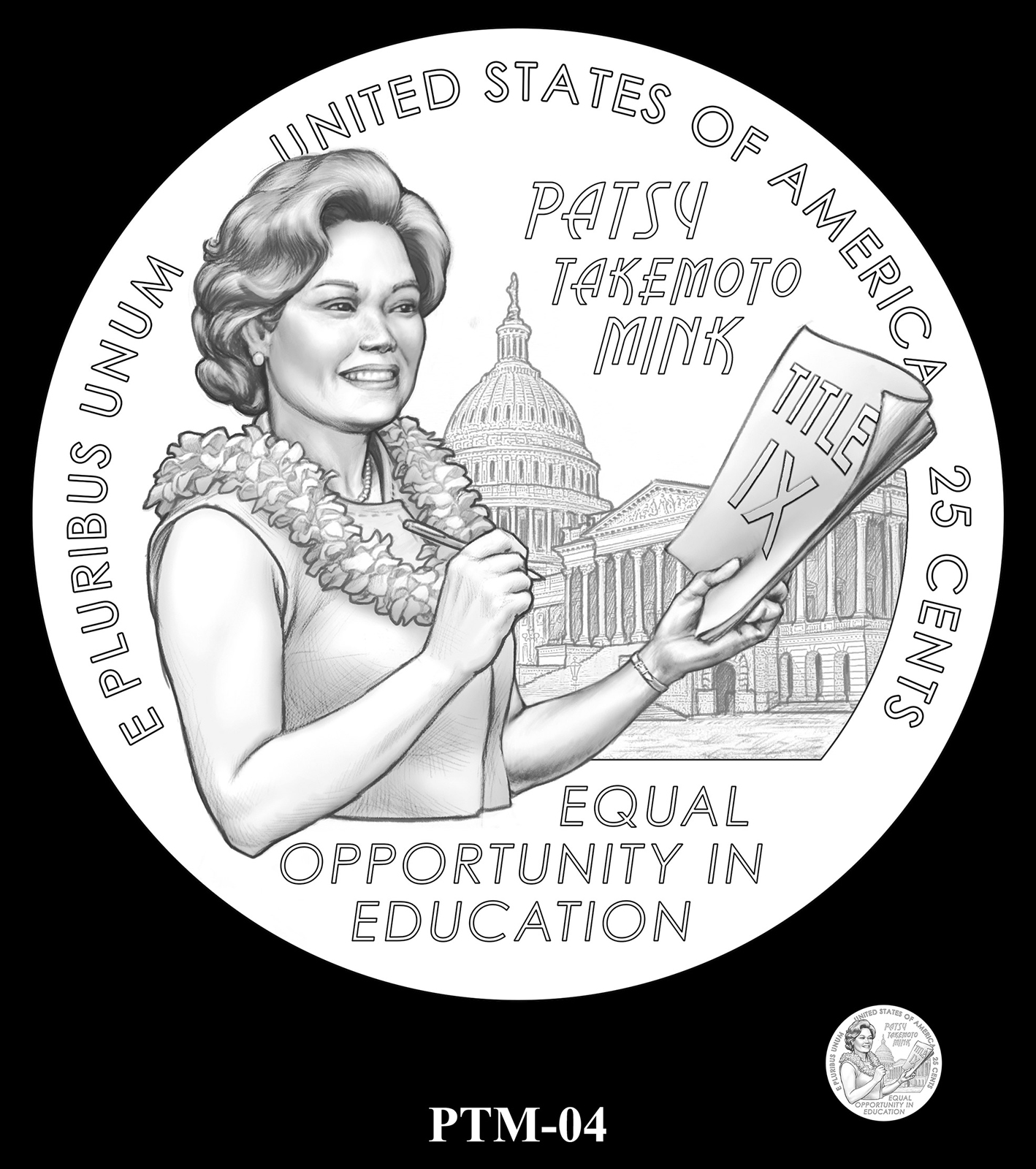 CCAC: The CCAC was fortunate to have her daughter, Ms. Gwendolyn Mink, join the discussion, reviewing the five reverse candidate designs. Following a robust discussion, involving Ms. Mink on many occasions, the CCAC voted to recommend to the Secretary of Treasury both reverse candidate designs PTM-04 and PTM-05. Ms. Mink shared that she too sees the merits of both the designs recommended by the CCAC. The CCAC’s recommendation was with the knowledge that the CFA favored PTM-05. Finally, the CCAC also recommended that should the Secretary select design PTM-05 that delimiters be used to separate the different inscriptions.