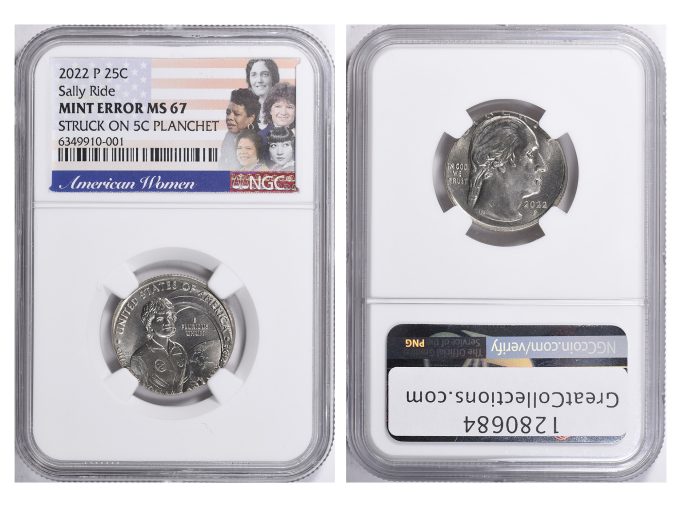 The first Dr. Sally Ride Quarter has been discovered struck on a Jefferson Nickel planchet. It has been certified and graded by Numismatic Guaranty Corporation (NGC) as NGC MS-67 and is being auctioned by GreatCollections on April 30th.